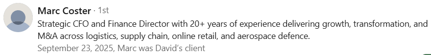 Have known David for years and he just has the knack of introducing something interesting, these days mainly possible acquisitions but in the past good potential recruits too. David knows his market and is always worth talking to.