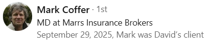 Having worked with David during 2021 I found him to be very professional, personable and very business like. I’d have no problem recommending him to other Insurance industry professionals.